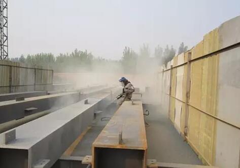 (3)热喷涂铝(锌)复合涂层:这是一种与热浸锌防腐蚀效果相当的长效防腐蚀方法。具体做法是先对钢构件表面作喷砂除锈,使其表面露出金属光泽并打毛。再用热喷涂设备的热源(乙炔—氧燃烧火焰、电弧、等离子弧等)将不断送出的铝(锌)丝融化,并用压缩空气吹附到钢构件表面,以形成蜂窝状的铝(锌)喷涂层(厚度约80μm~100μm)。最后用环氧树脂或氯丁橡胶漆等涂料填充毛细孔,以形成复合涂层。此法无法在管状构件的内壁施工,因而管状构件两端必须做气密性封闭,以使内壁不会腐蚀。这种工艺的优点是对构件尺寸适应性强,构件形状尺寸几乎不受限制。大到如葛洲坝的船闸也是用这种方法施工的。另一个优点则是这种工艺的热影响是局部的,受约束的,因而不会产生热变形。与热浸锌相比,这种方法的工业化程度较低,喷砂喷铝(锌)的劳动强度大。